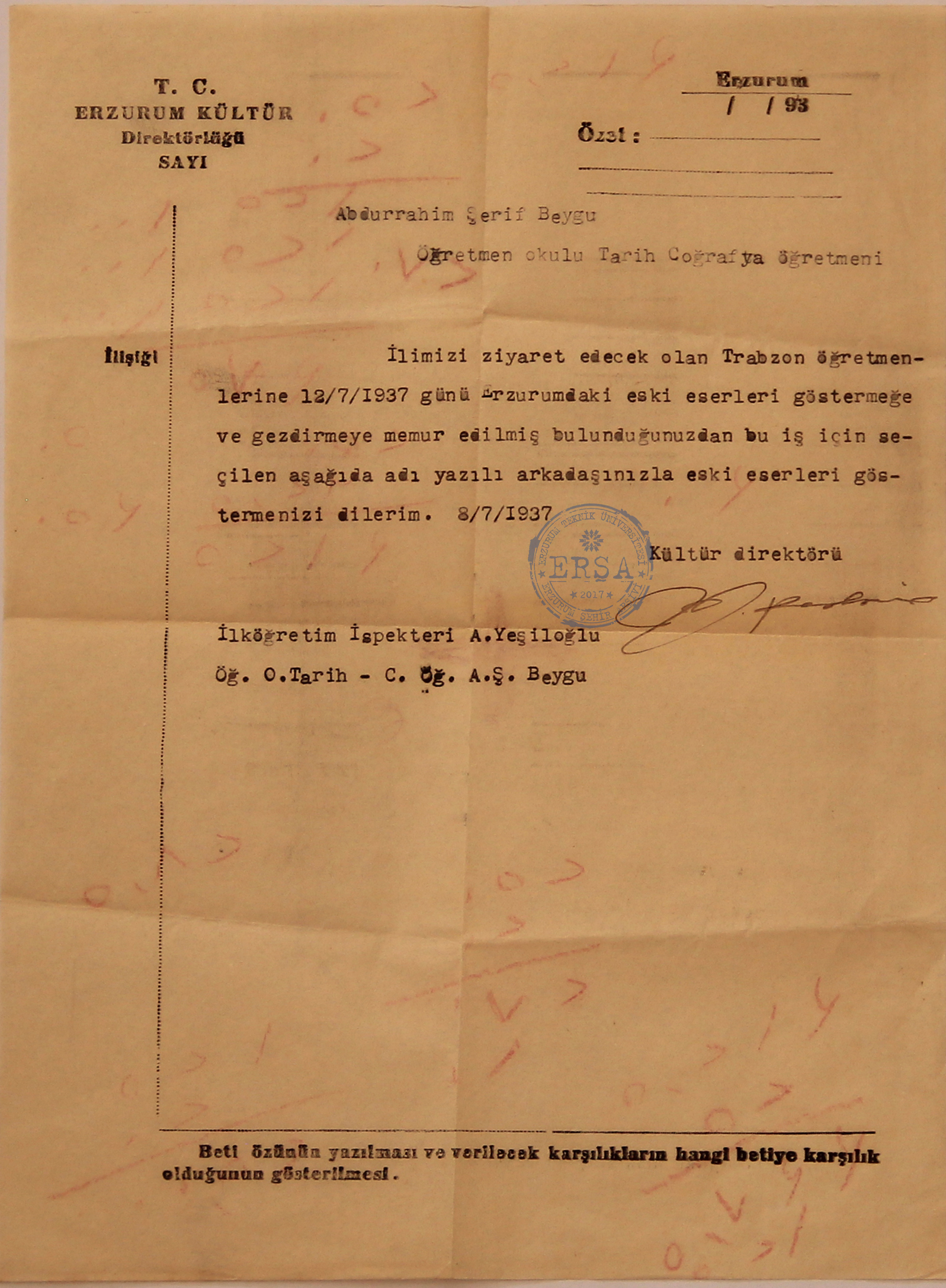 Erzurumu ziyaret edecek olan Trabzondan gelen öğretmenlere eski eserleri tanıtımla ilgili A. Şerif Beygu'nun görevlendirme yazısı