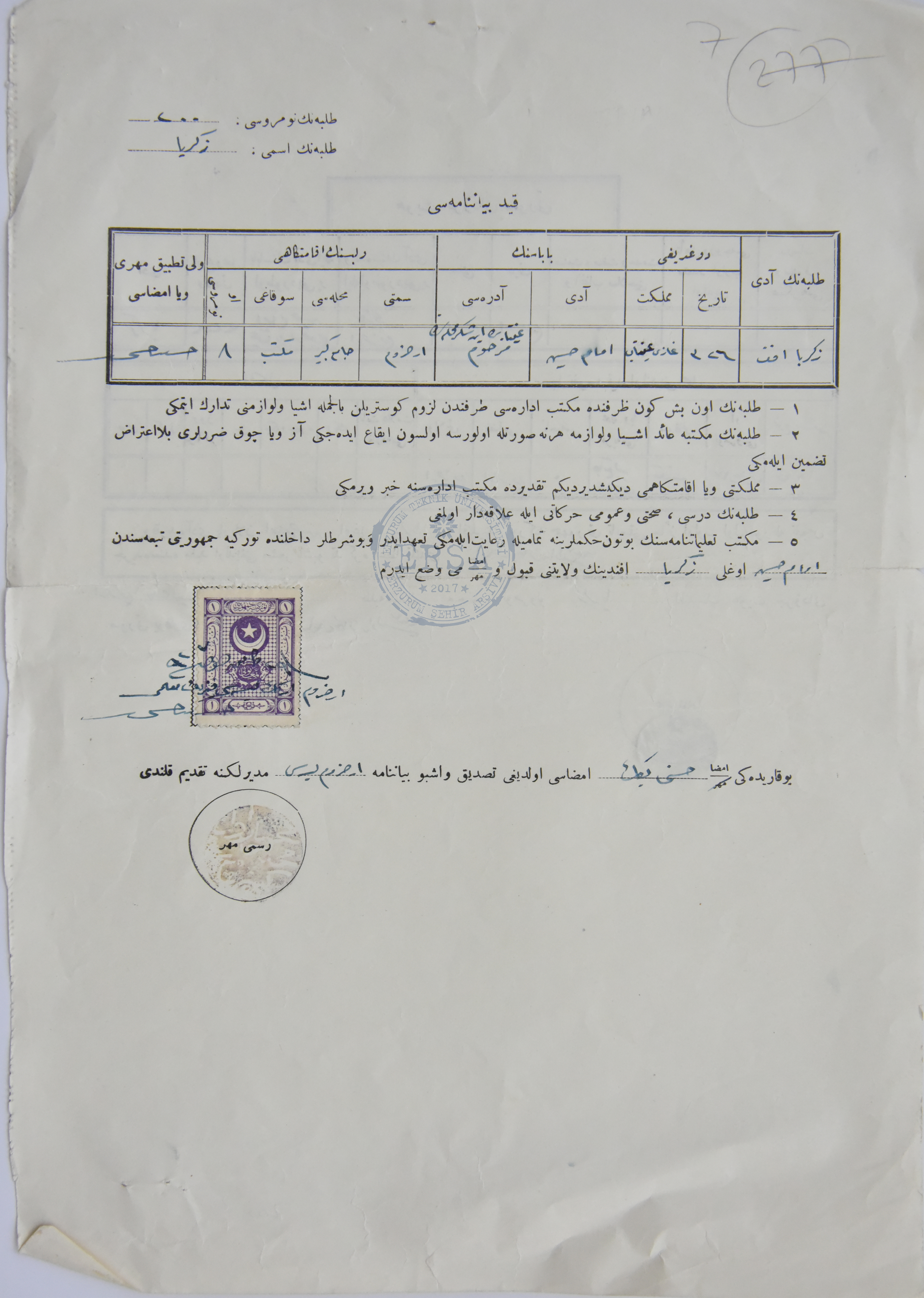 28 Teşrin-i evvel 340 tarihli Zekeriya Efendiye ait nüfus bilgilerinin bulunduğu tezkire, il muhaberi, hüviyet cüzdanı, beyanname