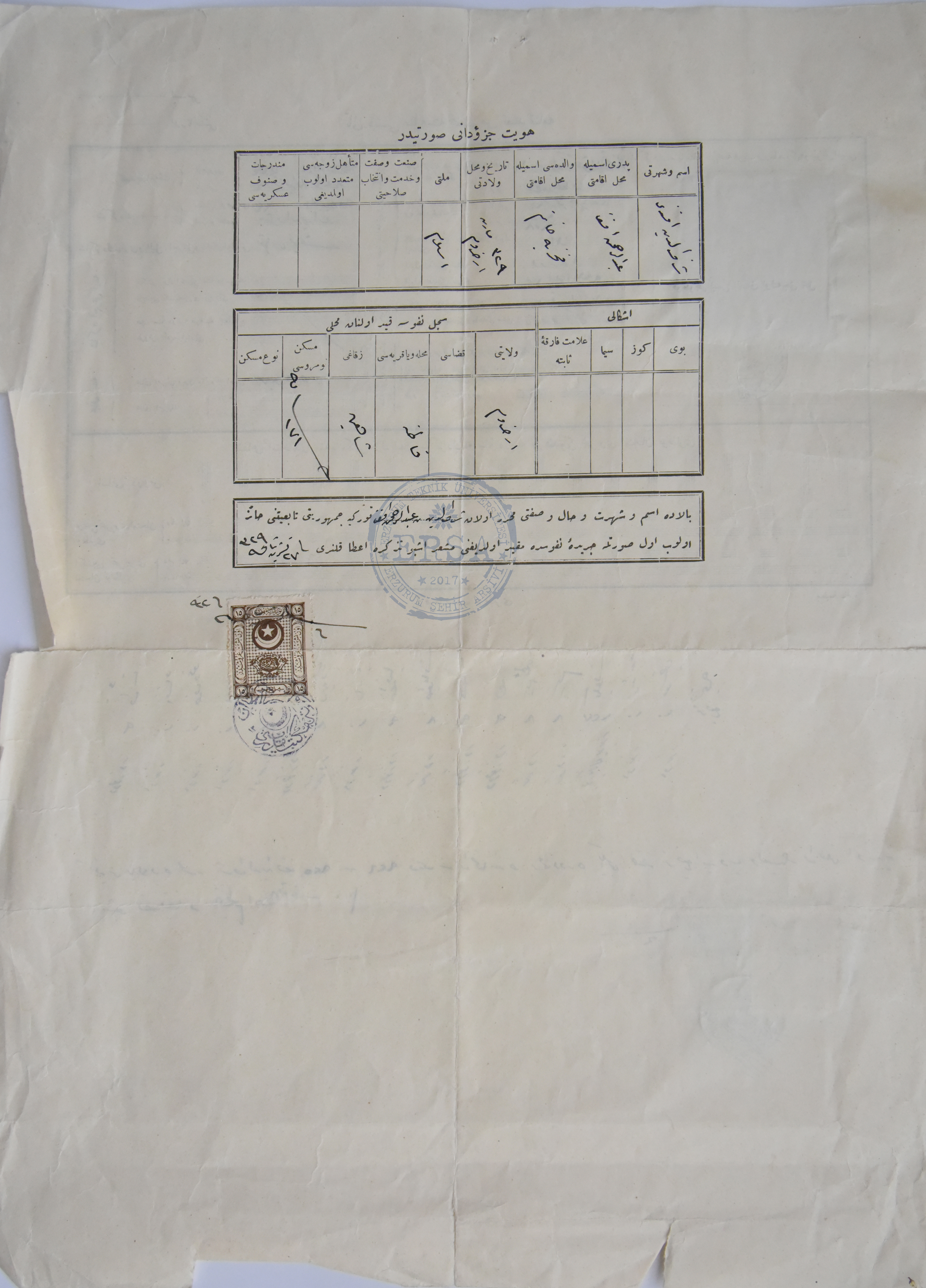 Erzincan Orta mektebi ilk kısmı talebesine mahsus tasdikname ve Şerafeddin Efendiye ait Hüviyet cüzdanı sureti