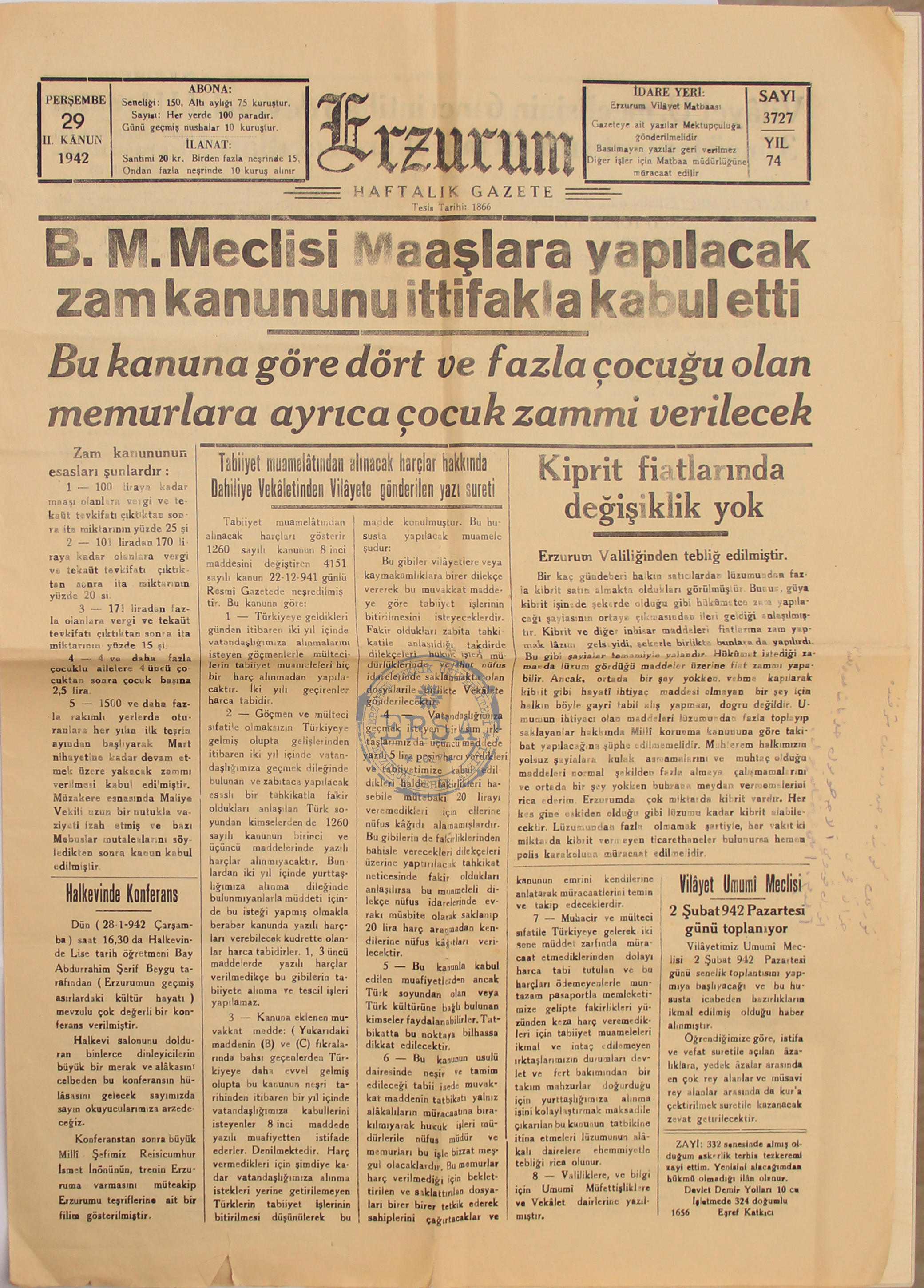 Abdurrahim Şerif Beygu'nun Halkevi konferansı haberi Erzurum gazetesinde