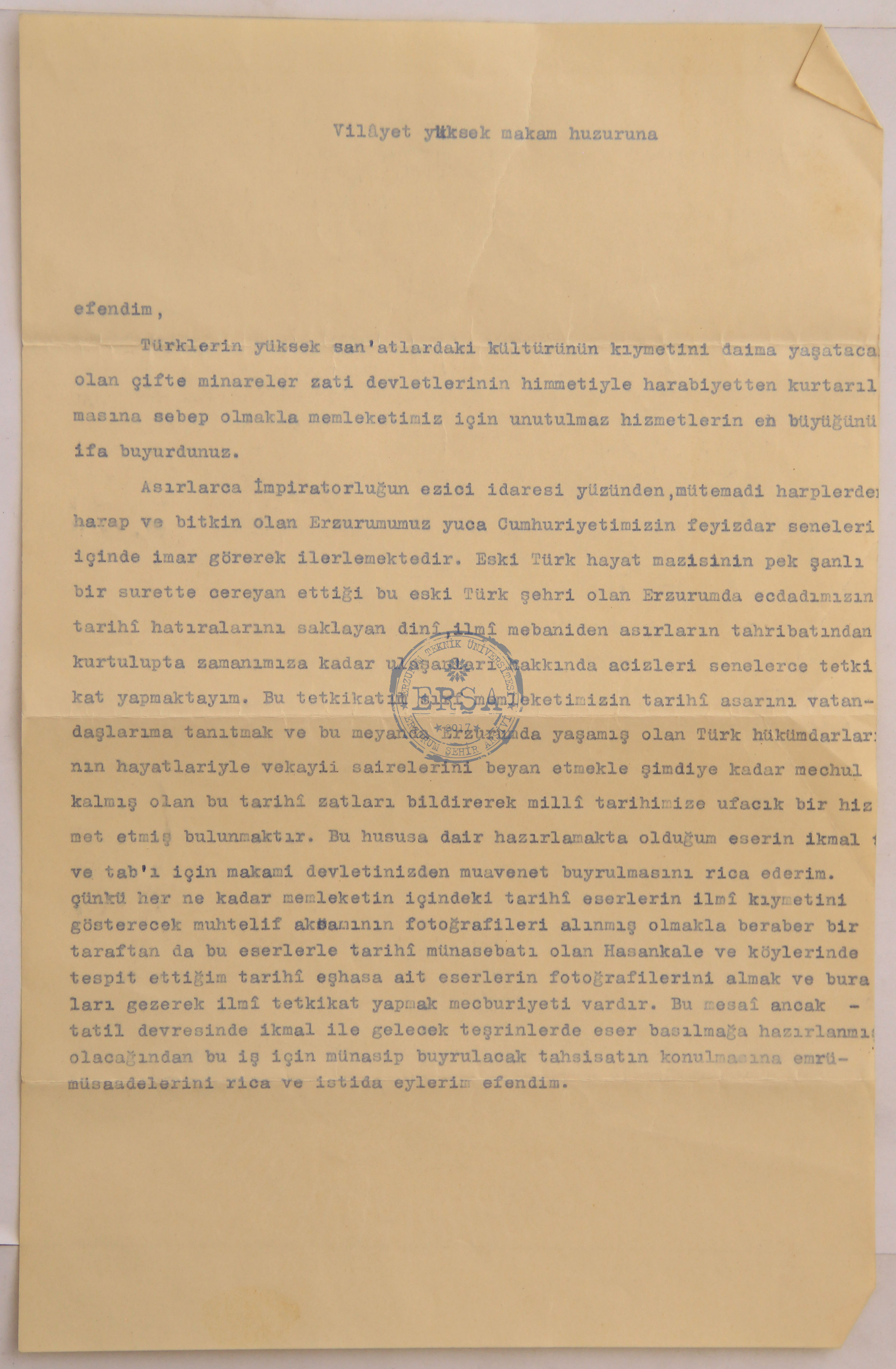 Abdurrahim Şerif Beygu'nun Erzurum ve yöresinde yapacağı araştırmalar ile ilgili vilayet yüksek makamına yazdığı yazı