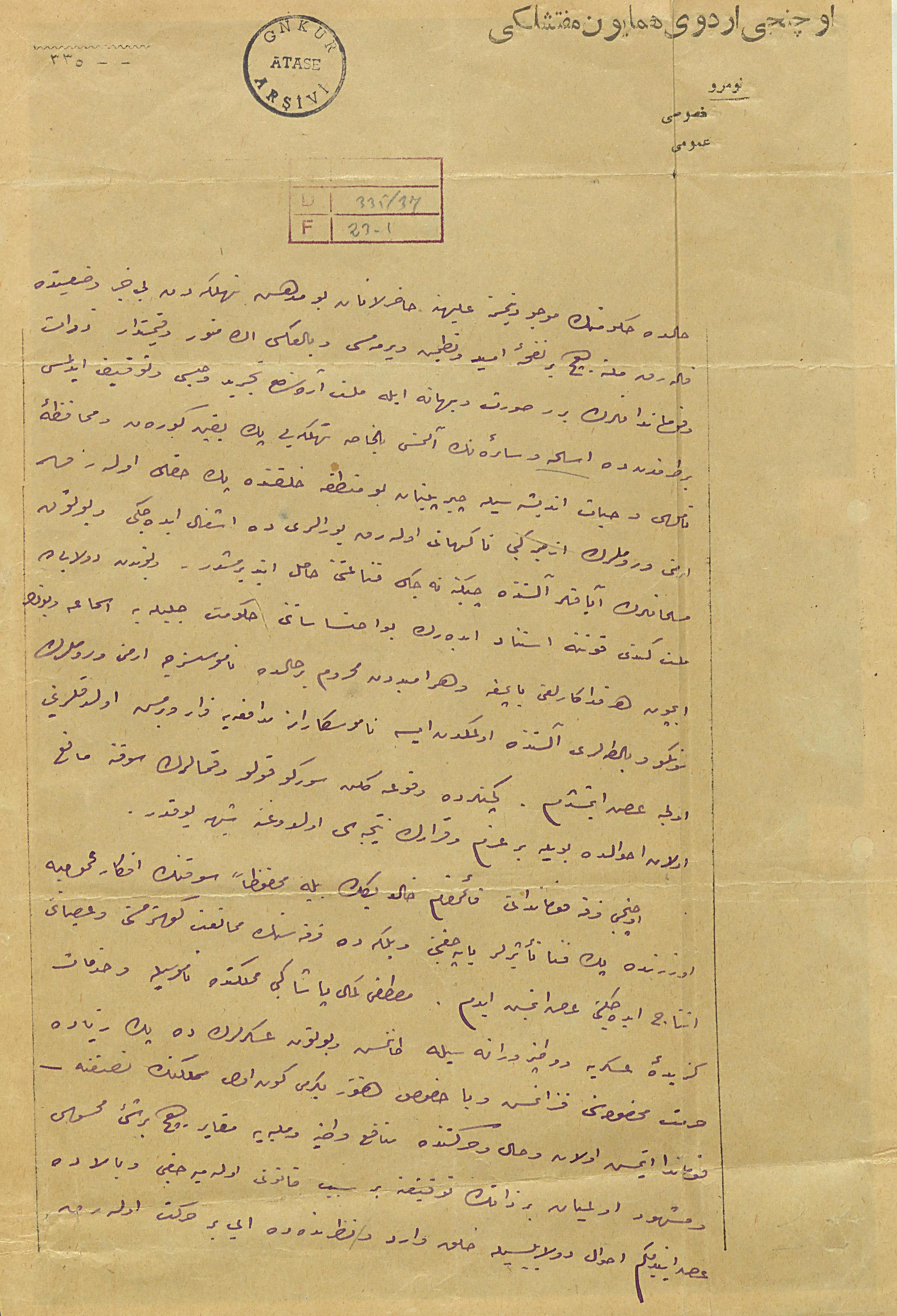 | dc.description.abstract | Harbiye Nezaretinin On Beşinci Kolordu Kumandanlığına gönderdiği Erzurum'da Hükümet aleyhine alınan kararlarla ilgili önlem alınması hususunda yazı- 30-7-1335 | |