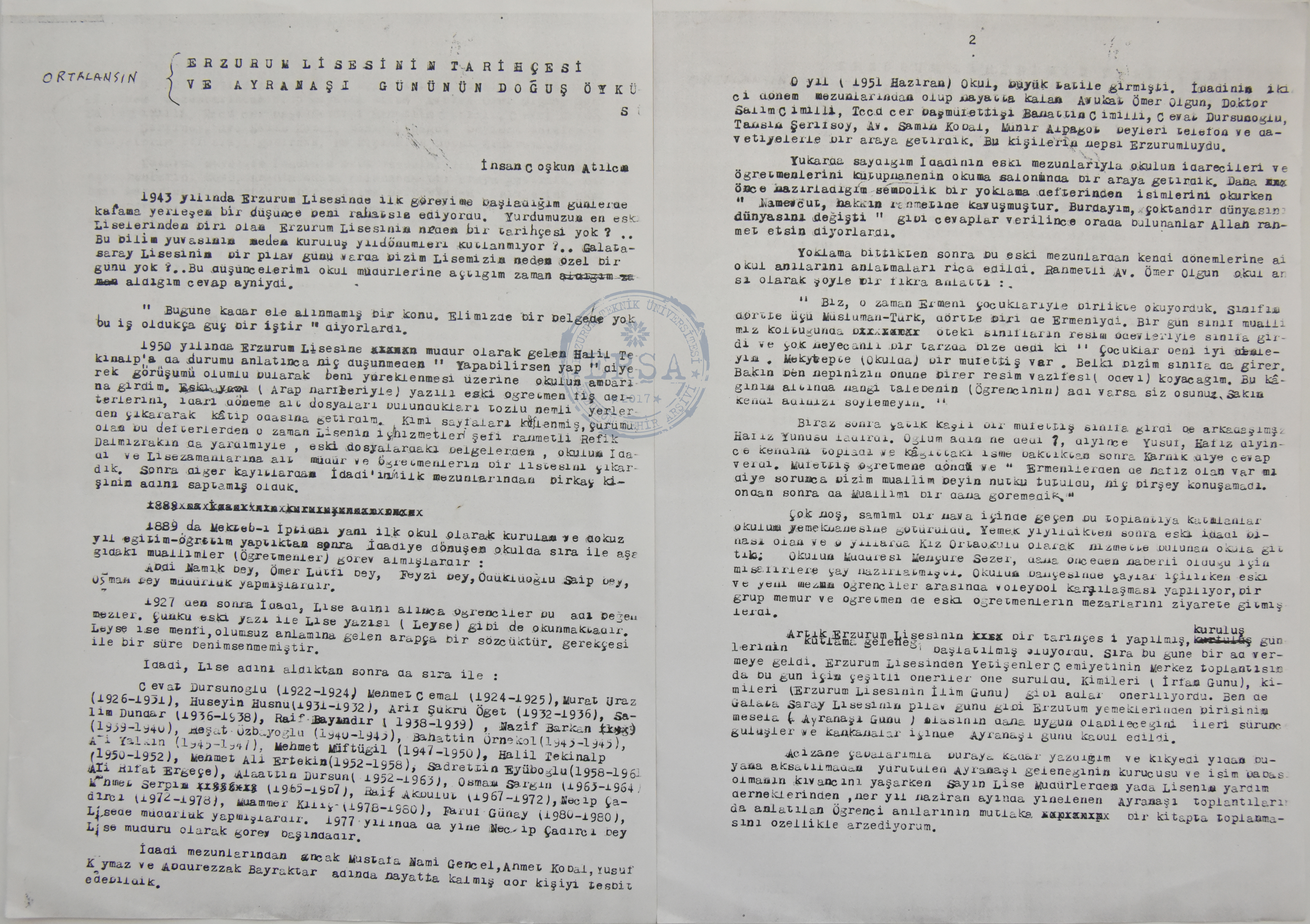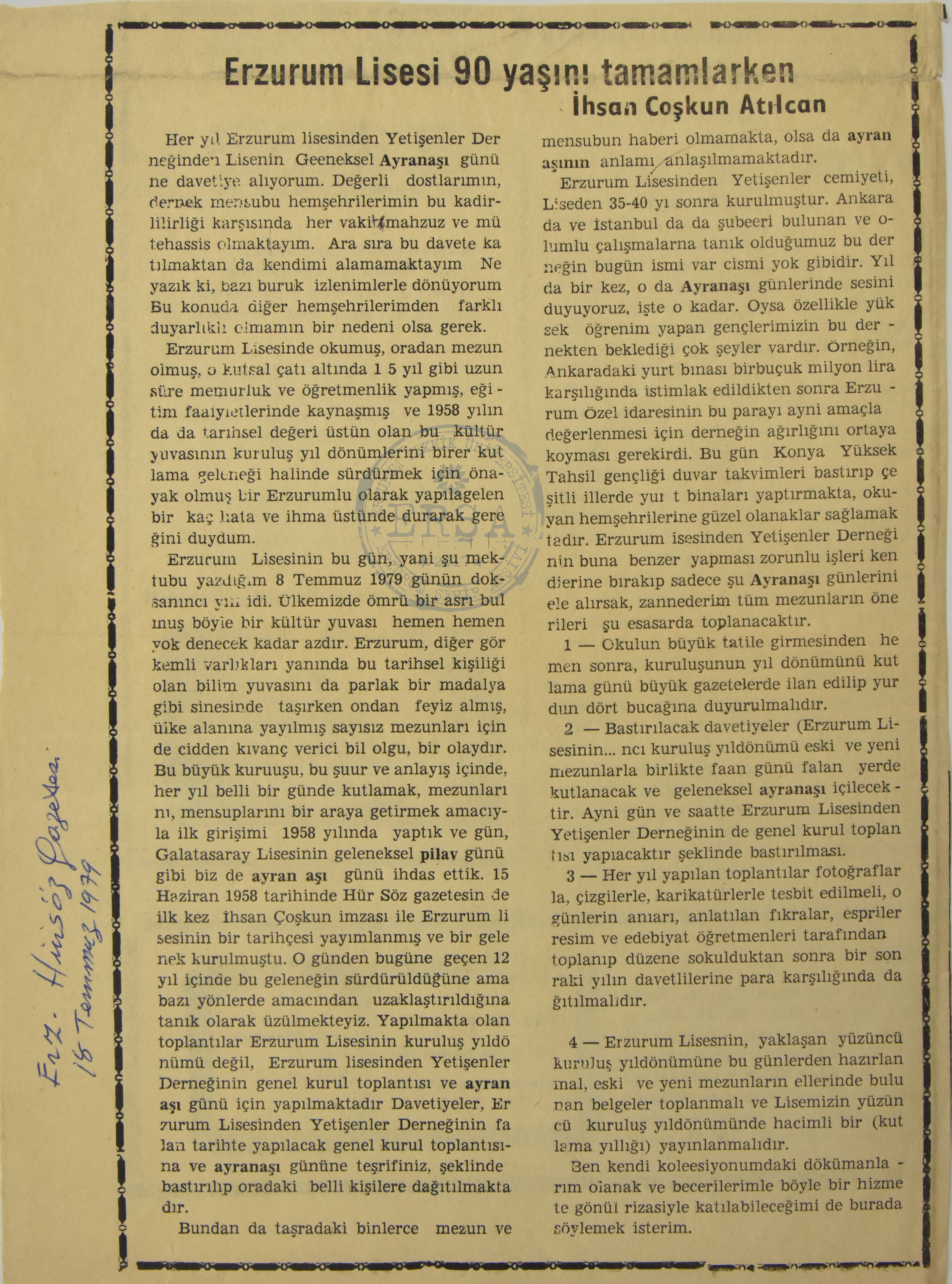 İhsan Coşun Atılcan'ın kaleme aldığı Erzurum Lisesi nin tarihçesi ve Ayran aşı gününün doğuş öyküsü