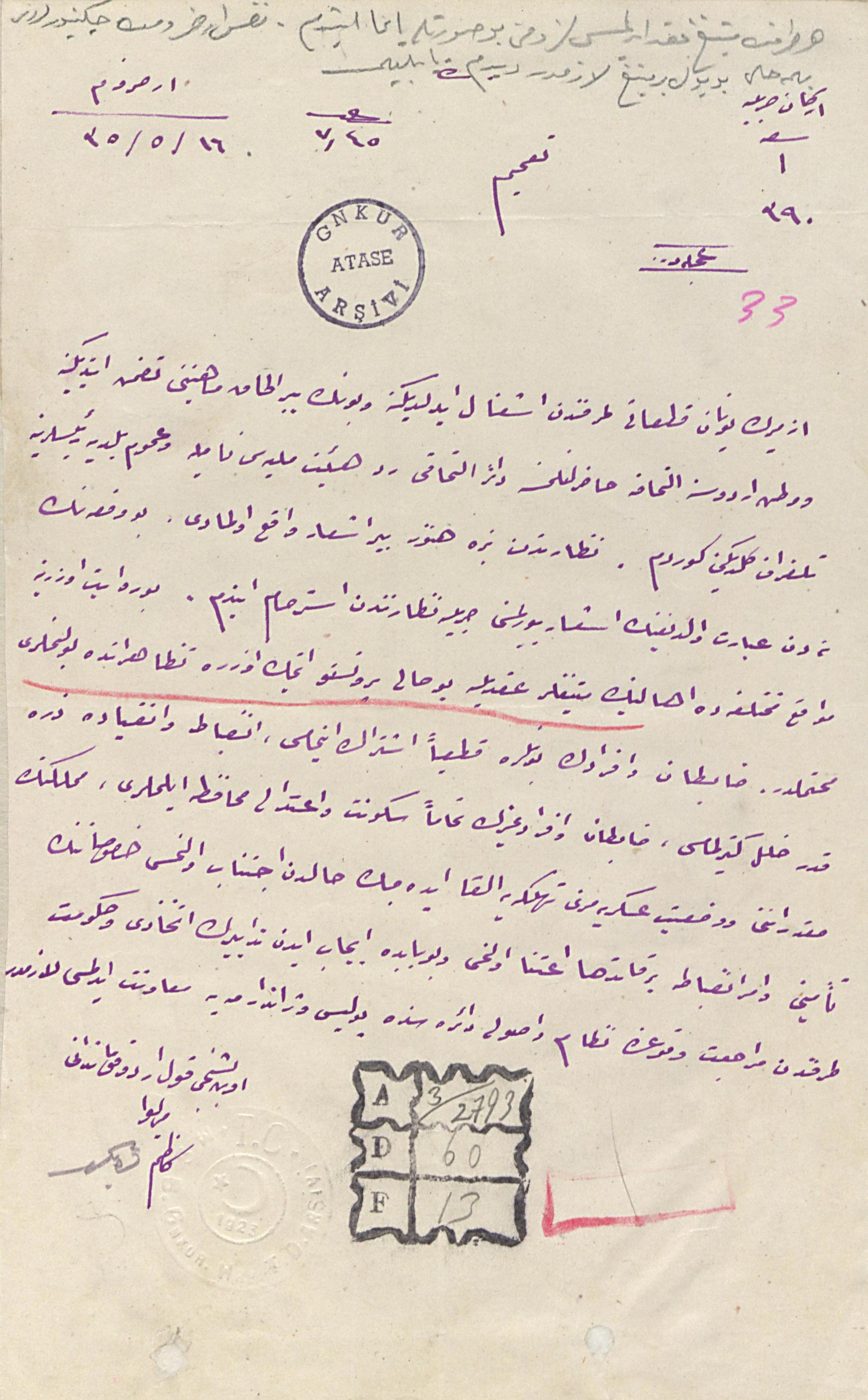 On Beşinci Kolordu Kumandanı Mîr-livâ Kâzım Karabekir Paşa'nın İzmir'in Yunan işgali dolayısıyla Erzurum'da düzenlenen büyük miting ile ilgili Erkân-ı Harbiyye Şu'be ile yazışması-16/5/1335