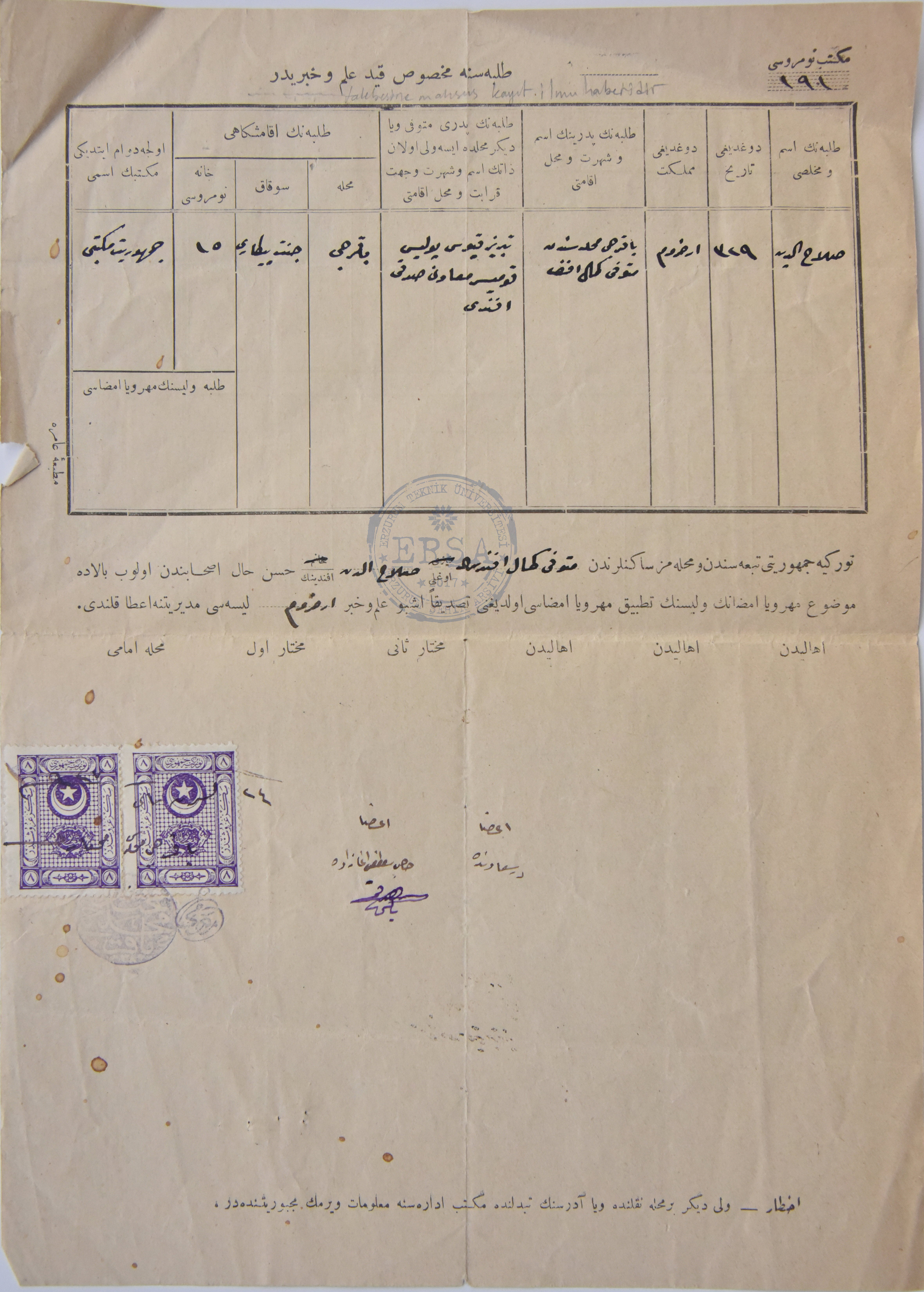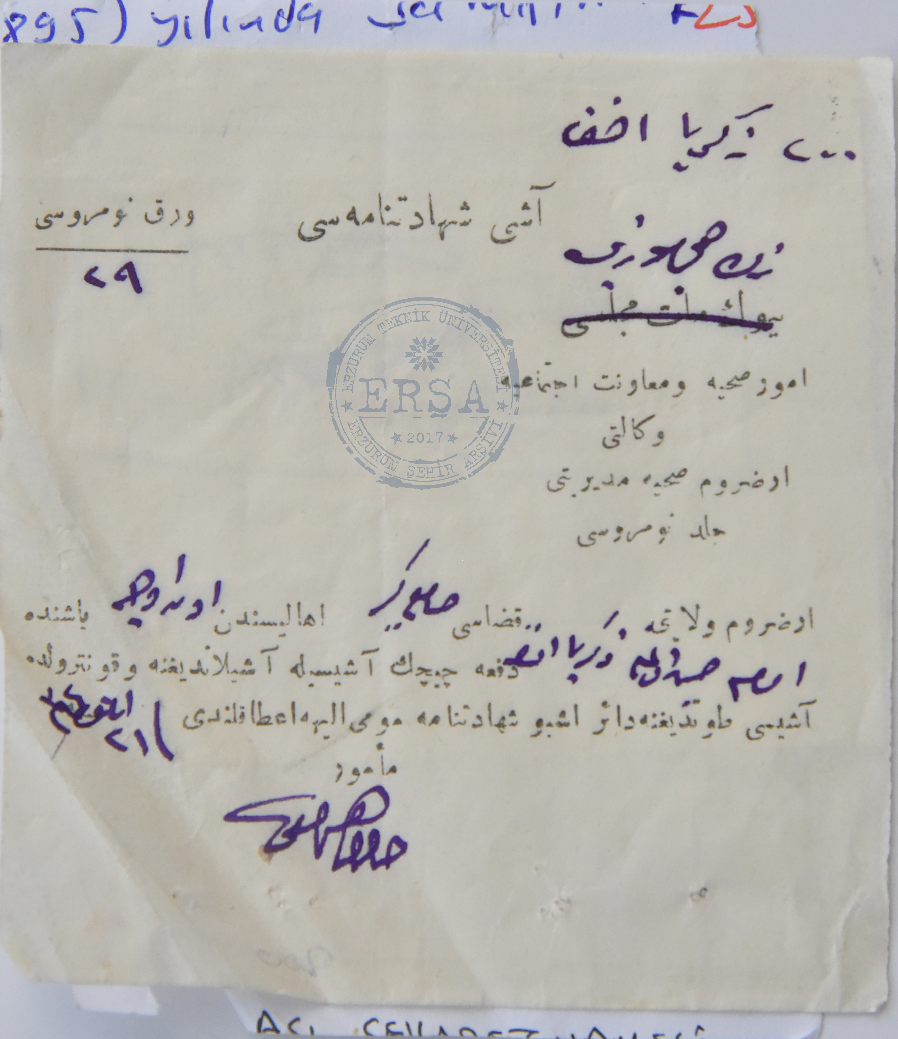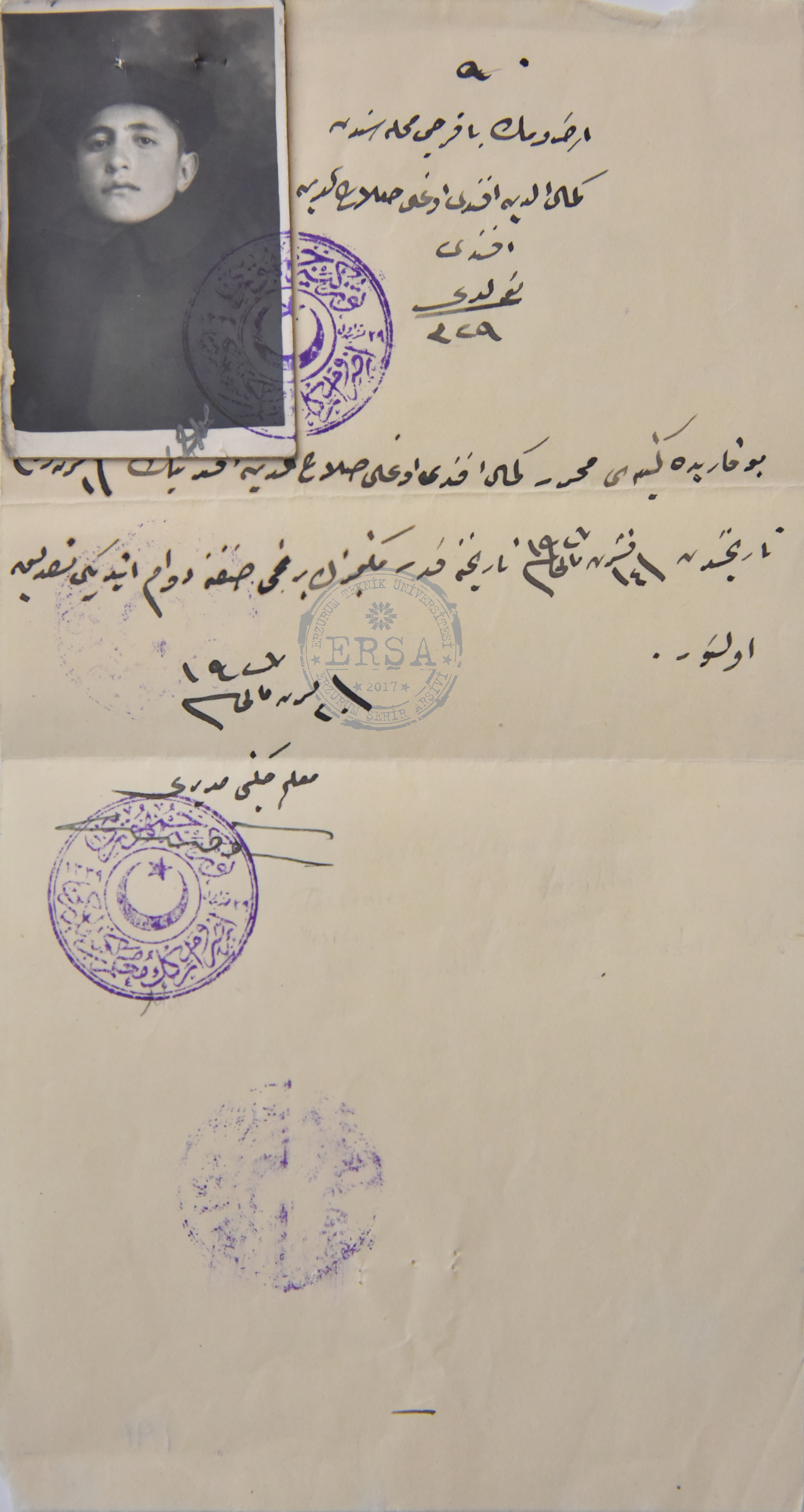 Erzurum Cumhuriyet ilk mektebi mezunlarından Selahattin Efendinin, muallim mektebine girmesiyle ilgili belge, Mektebin birinci sınıfını bitirdiğine dair belge, il muhaberi, hüviyet cüzdanı, aşı şehadetnamesi.