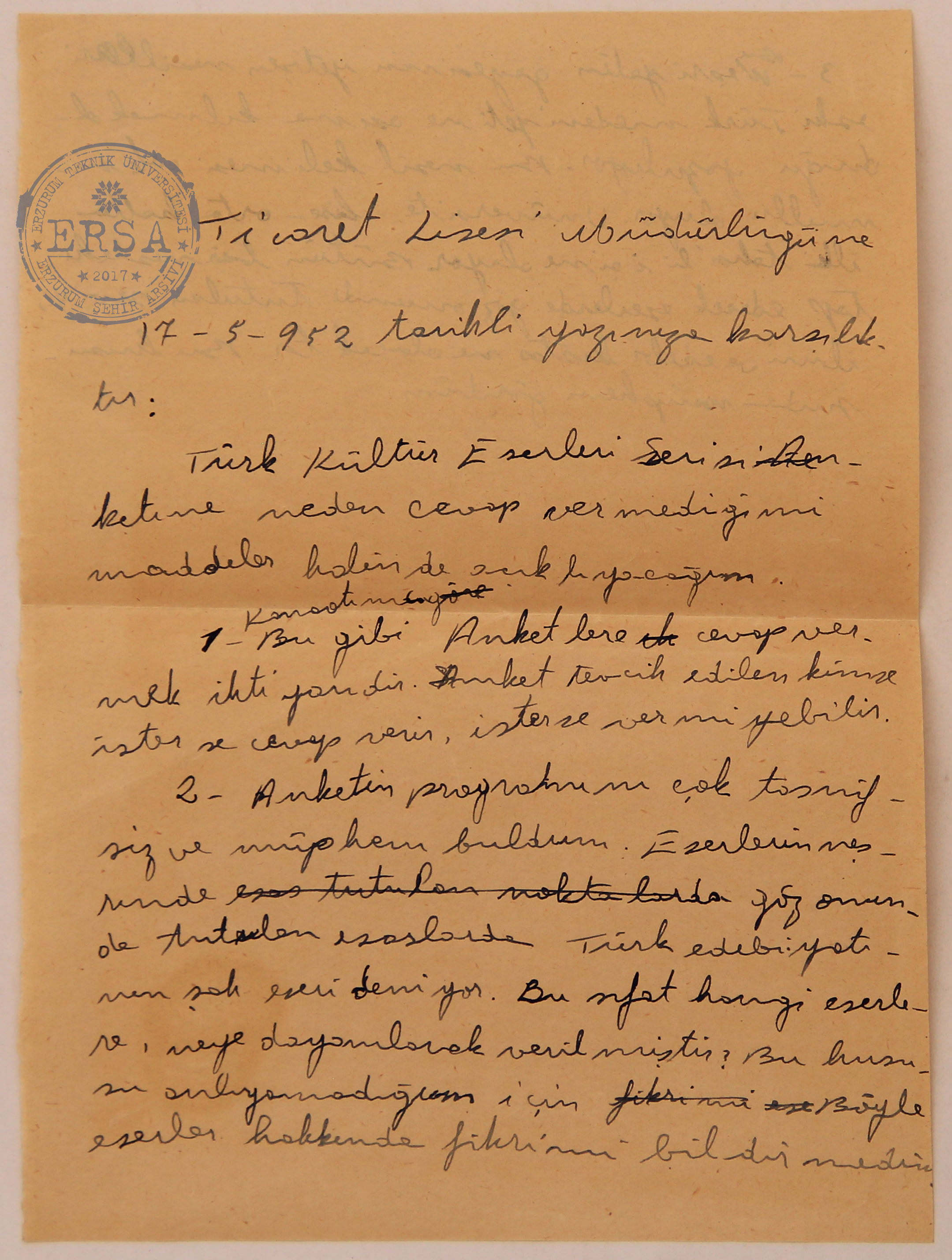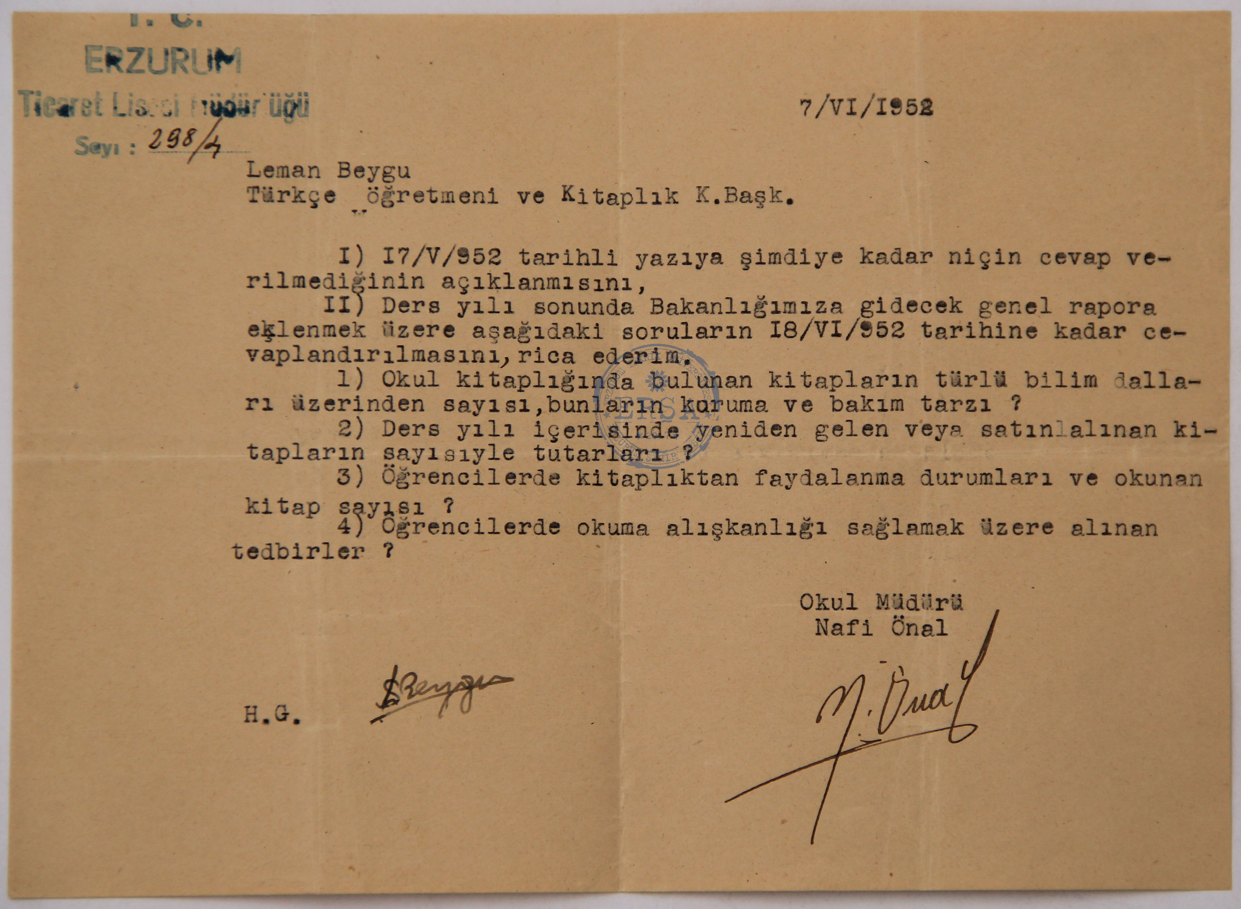 Leman Beygu'nun Erzurum Ticaret Lisesi ile yazışması